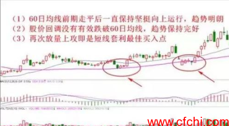 技术要点:此时的60均线的形态一定要翘头向上或持平。(注:15分钟、30分钟K线图中的60均线角度必须达到翘头向上。K线图60线翘头向上,股价再次回踩60均线得到支撑,或者股价再次放量上穿60均线,坚决买进!)