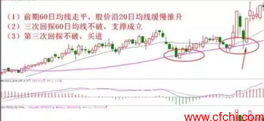 操作方法:个股在长期下跌后,股价第一次站上60均线,急进的投资者可以跟进,稳健的投资者可以等到股价洗盘回调到60均线附近区域得到支撑买入,极其准确。