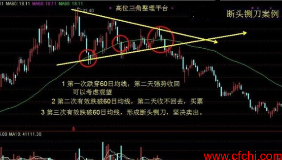 当股指在高位滞涨或横盘时,突然某天巨阴杀穿60日均线,意味着股价开始进入弱势态势,下跌才刚刚开始。