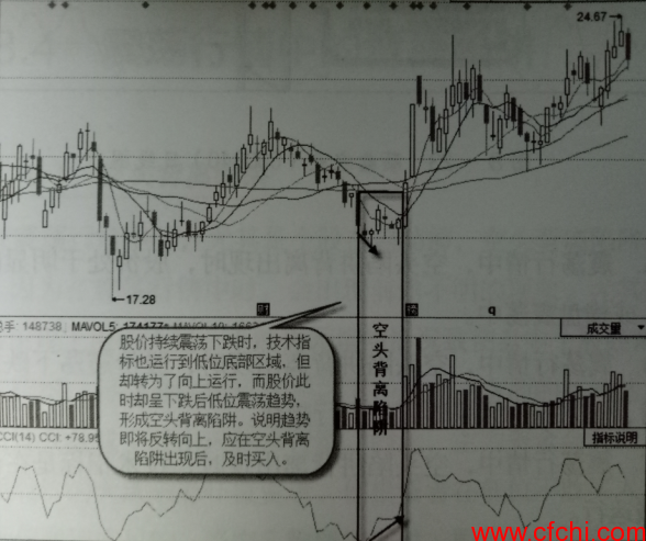 (3)在震荡行情中,当出现空头背离陷阱时,激进者可在背离出现后果断低位买入,稳健者可在低位企稳后及时买入。但若是有重大利空出现时,应中止买入的操作,待行情明朗后再介入。