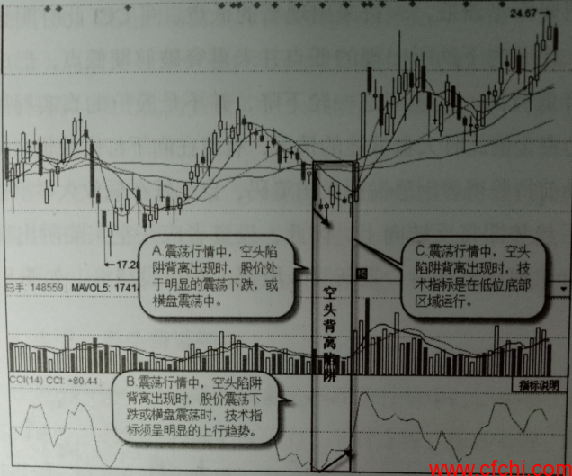 C.震荡行情中,空头陷阱背离出现时,技术指标是在低位底部区域运行。