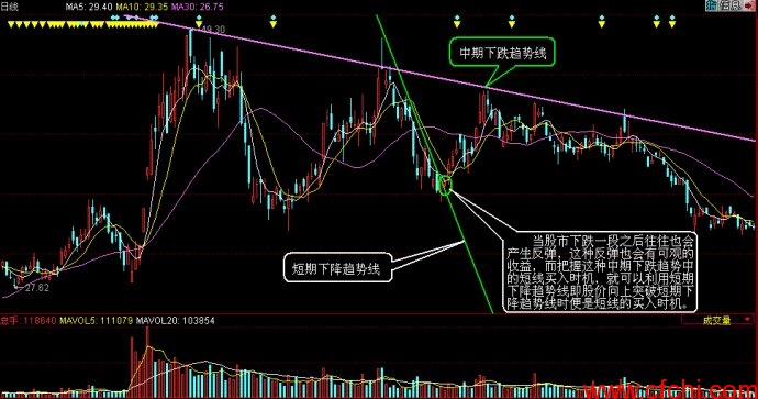 在中期下跌趋势中,股价主要以下跌为主,高点和低点都不断下移。但是,当股市下跌一段之后往往也会产生反弹,这种反弹也会有可观的收益,而把握这种中期下跌趋势中的短线买入时机,就可以利用短期下降趋势线即股价向上突破短期下降趋势线时便是短线的买入时机。