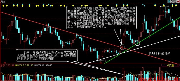 、长期下降趋势线向上突破应有成交量放大的配合且最好伴以中长阳线,否则可靠性降低或后市上升的空间有限。