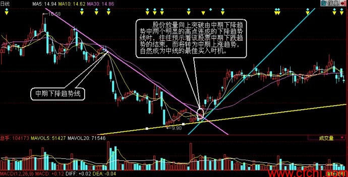 、下降趋势中,下降趋线的向上突破是中期下降趋势结束而转为中期上升趋势的信号,也是实际操作中非常重要的买入时机。