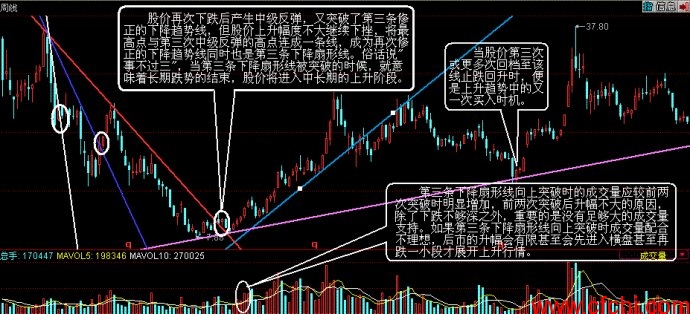 、下降扇形线属于中长期的压力线,一般出现在大熊市里,而第三条下降扇形线的向上突破通常是熊市结束、牛市开始的强烈信号,因此是中长线最佳的买入时机。