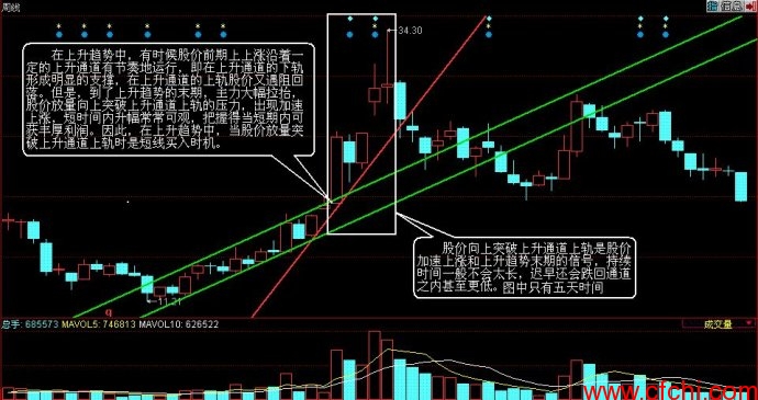 、股价向上突破下降通道时,应有成交量放大的配合,否则突破的可靠性降低或股价出通道后也难于上涨而横向运行。