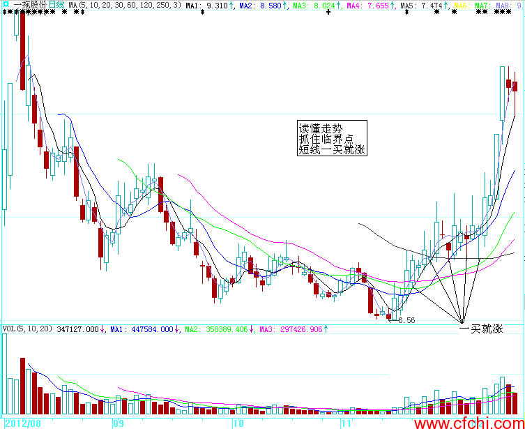 最近两周大盘反弹,对于大盘这波发力,我们不难观察到是带量的,并且是权重最先发力的,如民生银行创出四年新高。这意味着随着城镇化加速建设的推广,拉动新一轮经济增长的马车逐渐明朗。股市将会率先反映出来,水泥板块已经率先突破年线,个股拉升波最近也是轮番起舞,更有不少股持续涨停,赚钱效应明显,比如班长反复说的一拖股份,在最近20个交易日中已涨50%。
