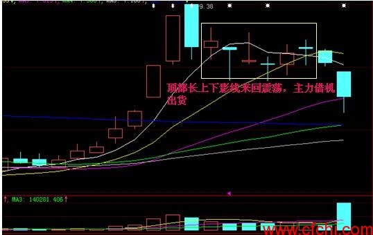 4、长上影线:上升行情中股价上涨到一定阶段,连续放量冲高或者连续3-5个交易日连续放量,而且每日的换手率都在4%以上。当最大成交量出现时,其换手率往往超过10%,这意味着主力在拉高出货。如果收盘时出现长上影线,表明冲高回落,抛压沉重。