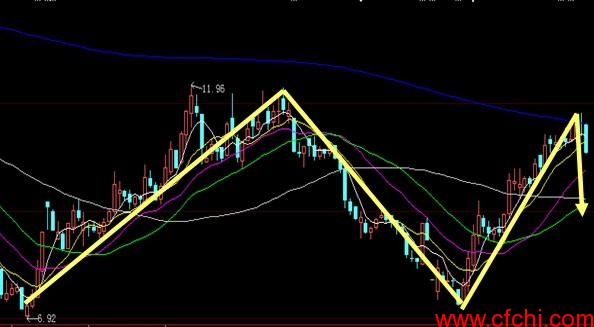 2、双头:当股价不再形成新的突破,形成第二个头时,应坚决卖出,因为从第一个头到第二个头都是主力派发阶段。M字形是右峰较左峰为低乃为拉高出货形,有时右峰亦可能形成较左峰为高的诱多形再反转下跌更可怕,至于其它头形如头肩顶、三重顶、圆形顶也都一样,只要跌破颈线支撑都得赶紧了结持股,免得亏损扩大。