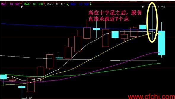 6、高位十字星:上升较大空间后,大盘系统性风险有可能正在孕育爆发,这时必须格外留意日K线。当日K线出现十字星或长上影线的倒锤形阳线或阴线时,是卖出股票的关键。日K线出现高位十字星显示多空分歧强烈,局面或将由买方市场转为卖方市场,高位出现十字星犹如开车遇到十字路口的红灯,反映市场将发生转折,为规避风险可出货