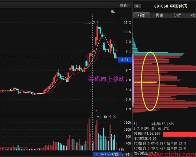 3、拉升阶段,股价不断的上移,筹码上移,持有者都是出于获利阶段。