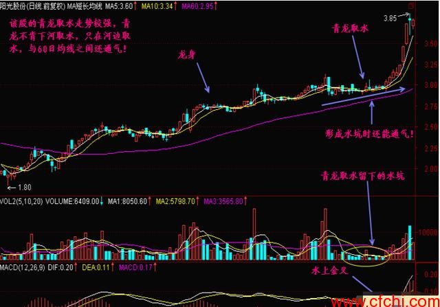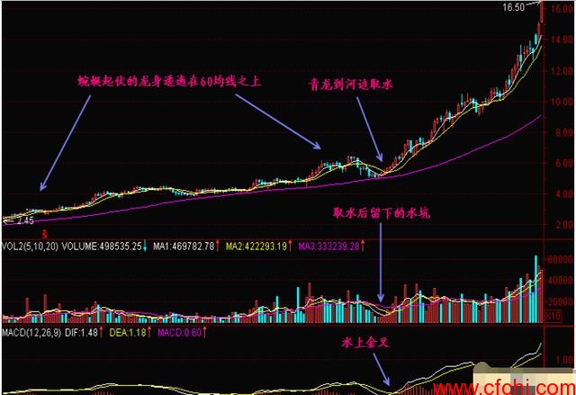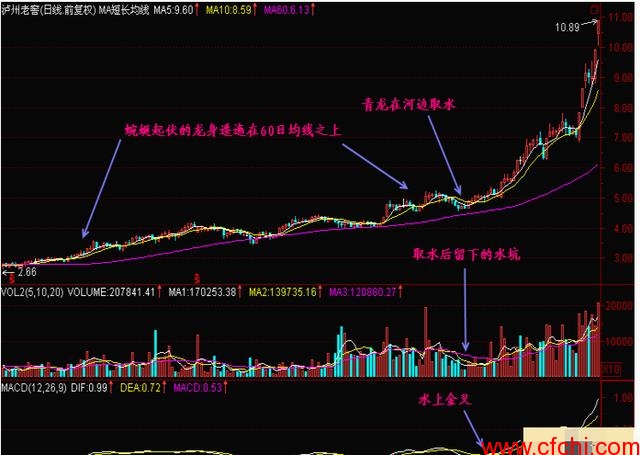 (2)然后龙头回到60日均线附近,犹如青龙入河取水。同时在成交量柱体图上会出现一群量芝麻点,犹如取水后留下的水坑。