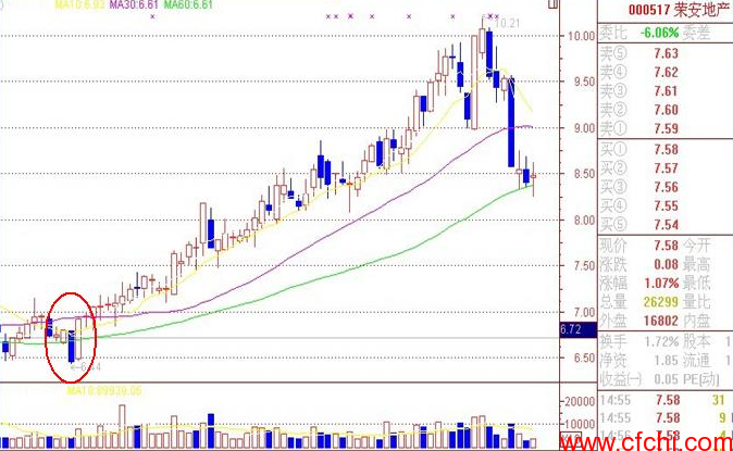 改过自新 低档急跌后上拉线:股价在低位加速下挫,形成中大阴线,第二天由于某些重大利好消息影响,股价直接跳高于前一阴线的实体内开盘,并顺势上攻,高收于当天的偏高价位,走出一根实体长大的上拉阳线,这通常是股价止跌反弹的信号。虽然随后几天股价可能向下回落,但只要空头无法将这根上拉阳线吃掉,股价就会向上反弹。本K线组合通常是低档大幅震荡的走势,多空双方全力施为,形势变化极快。由于有消息面的配合,力量的天平一般会向多方倾斜,虽然需要一些时间来筑底,但要再创新低也是比较困难的,故投资者一般可以考虑择低介入。在具体操作中,要认真观察个股的基本面和消息面,以提防某些主力和机构借此图形出货。