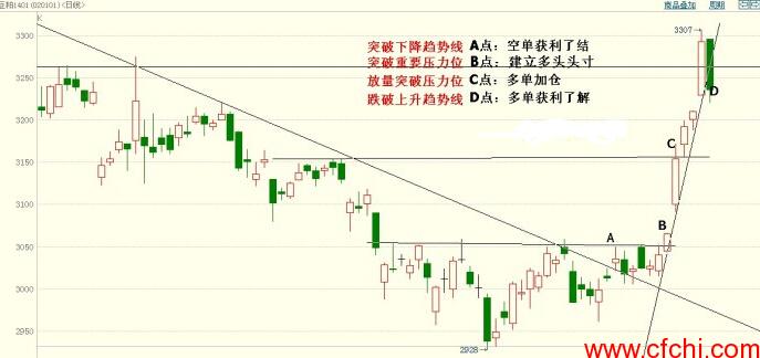 3、收盘跌破上涨趋势线,多单获利了结。