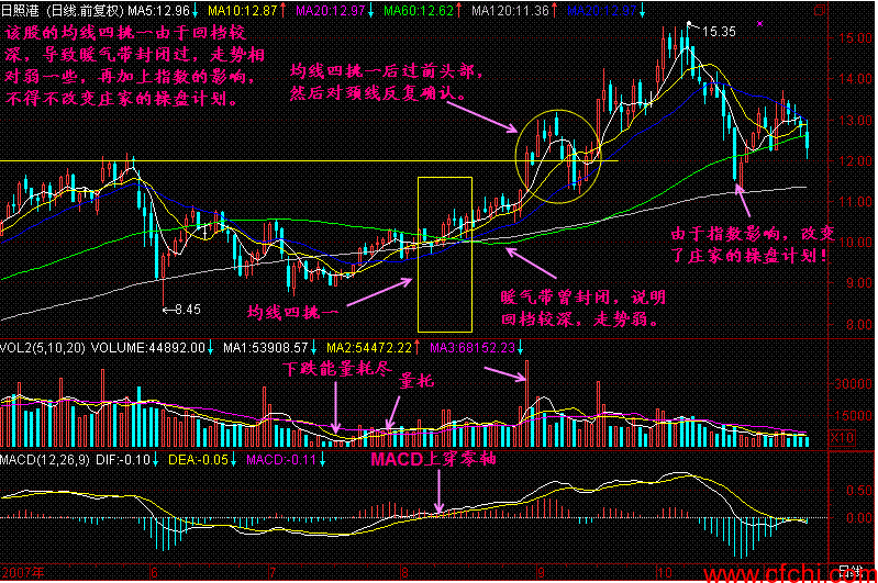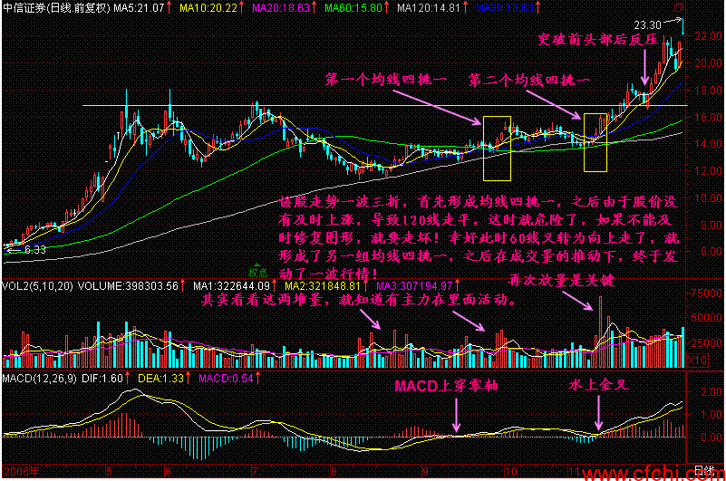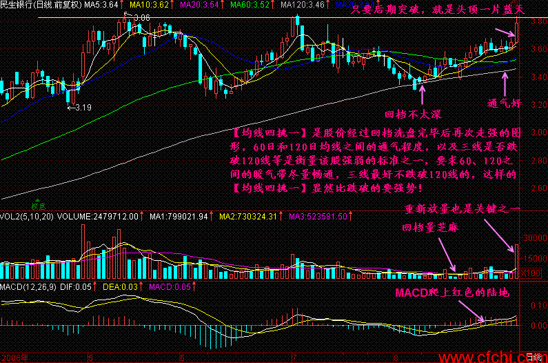 该图形要求60日均线和120日均线之间最好能通气,否则说明走势弱一些,还有股价回到2 3区间必须放量,否则很可能没法冲过前头部,当然这个放量可以比前头部的量小,形成轻松过头的走势,代表庄家控盘,但起码还是需要一些成交量的支持的。其余还要配合MACD上穿零轴等图形,只要均线四挑一后能够突破前头部,那么就形成五线顺上的良好局面了!