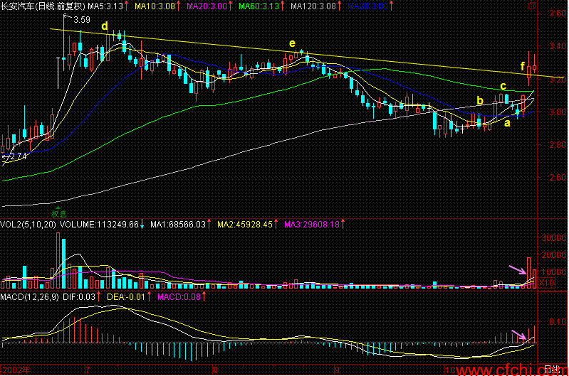 现在再把【高点连线】加上去,就可以发现股价上面确实没有什么遮拦物了。我们在图上标一下,a为三条均线,b为120均线,c为60均线,越过由d和e形成的【高点连线】,在f点实施突破,突破以后又反压这根【高点连线】,一旦反压成功,它再跌破这根【高点连线】的可能性就不大了。因此,这种【均线四挑一】走势,是一种强劲向上突破的走势,该股后市会逐步地走强。
