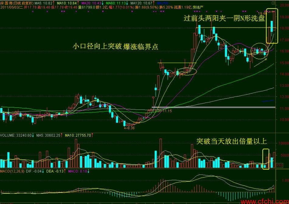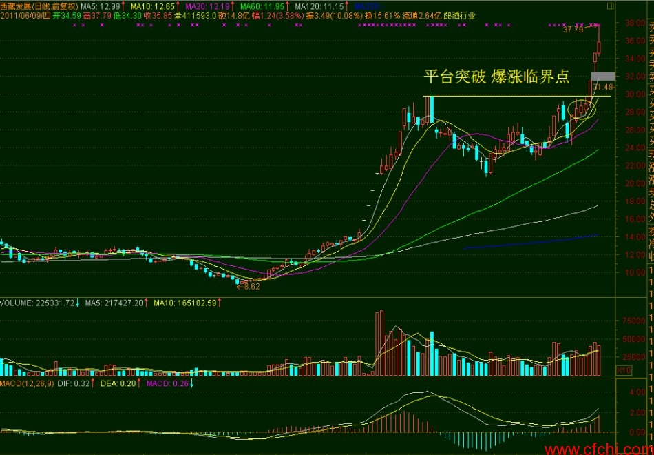 股价放量打拐的瞬间是爆涨临界点,平台突破的瞬间是爆涨临界点;股价过高点线的瞬间是爆涨临界点;小口径向上喷出的瞬间是爆涨临界点;过平台不准踏空,就是要求买在爆涨临界点上;爆涨临界点以前,线之下,是慢慢的涨,是匍匐前进;爆涨临界点,是噗哧窜出去,以后是跳跃的涨。