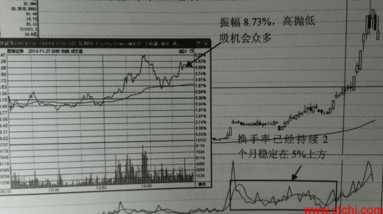 结论:分时图中成交量足够大,换手率能够达到前期的水平,那么股价波动强度自然很高。判断高抛低吸交易机会的时候,换手率能够达到5%以上的个股是我们短线交易的重要品种,这样的活跃股票值得我们花更多精力去关注。