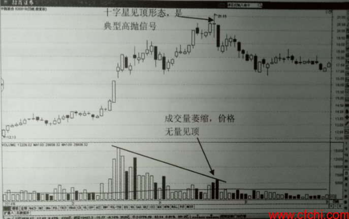 睛论:十字星成为顶部反转形态,价格回升趋势和成交量萎缩是不可忽视的两个信息。这两个信息,提供了十字星反转的高抛信号。