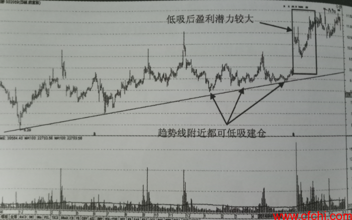 股价如果处于多头趋势,那么价格总是能够在调整期间获得支撑。经过确认的回升趋势线是非常典型的低吸价位。我们在回升趋势线附近考虑买人股票,将轻松获得廉价筹码,提升赢利空间。