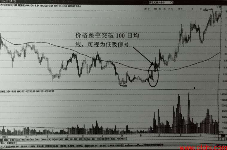 要点2:跳空形态是非常典型的突破信号,而该股跳空形态恰好就出现在100日均线附近,我们可以断定接下来趋势是回升。低吸建仓没有任何问题。