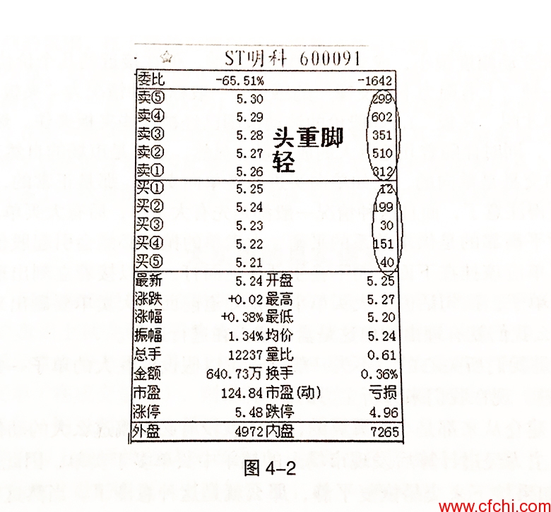 图4-2就是ST明科(600091)在2011年11月11日收盘时的盘口。卖①到卖⑤都是过300手的大单,买①到买⑤均为100手左右的小单,属于上压板的情况。