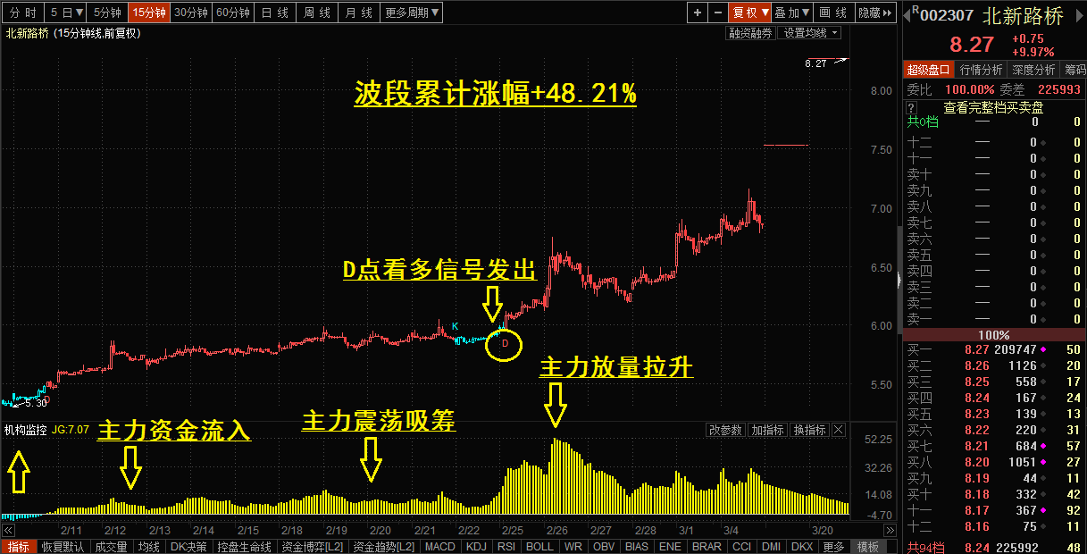 北新路桥——主力资金震荡吸筹后放量拉升,自D点看多信号发出后波段涨幅超40%。