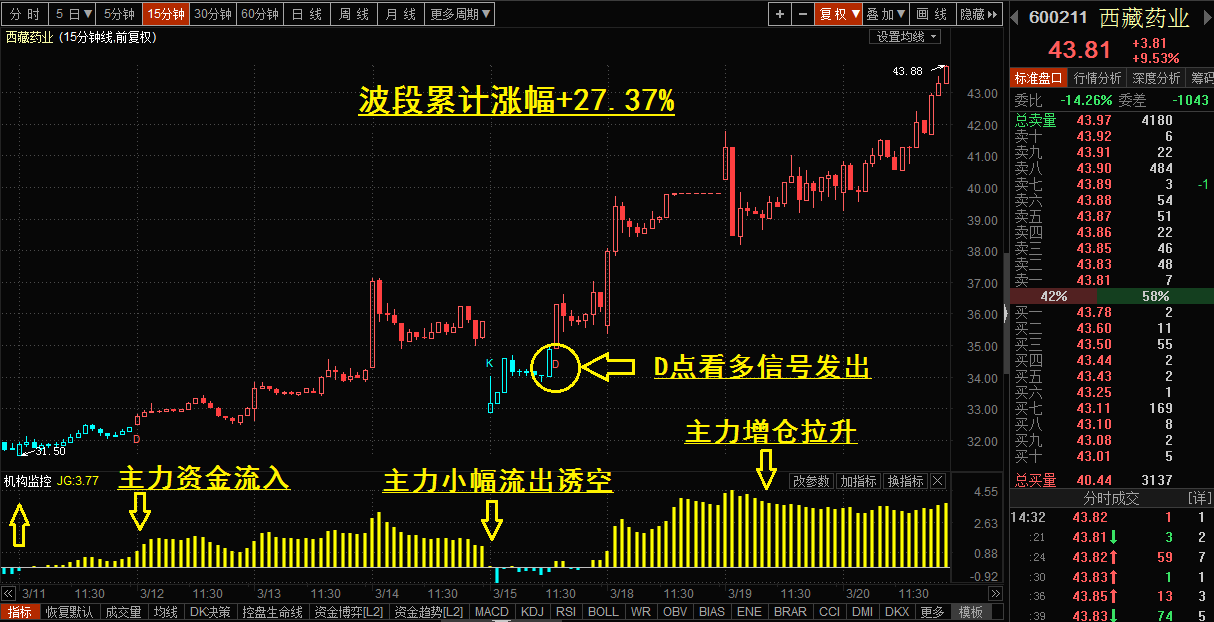 西藏药业——主力资金小幅流出诱空后增仓拉升,自D点看多信号发出后波段涨幅近30%。