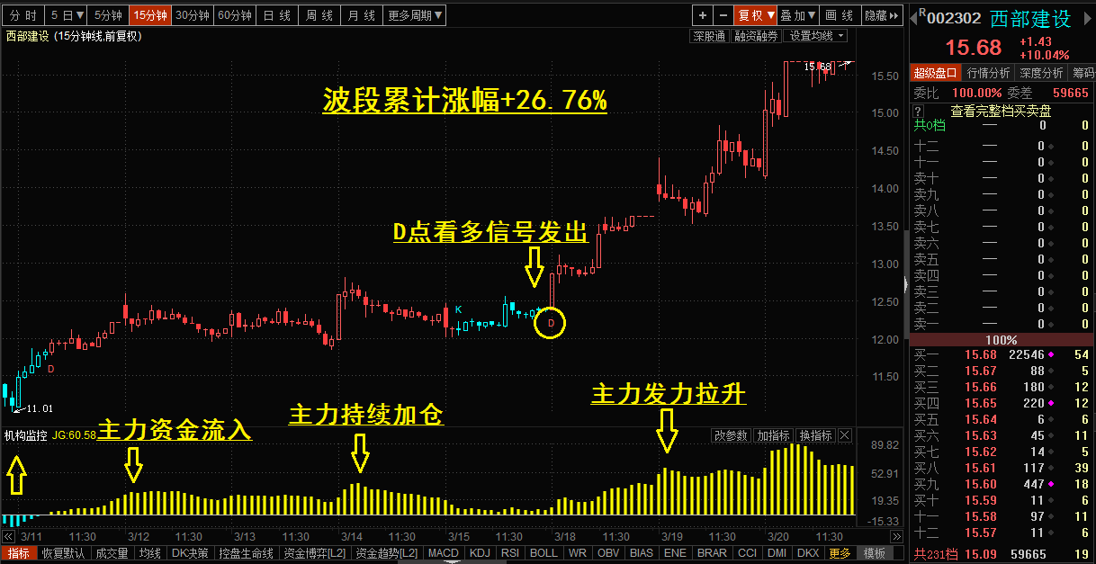 西部建设——主力流入后持续加仓,筹码高度集中,自D点看多信号发出后波段涨幅超20%。