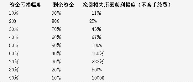 这组数据告诉我们:损失越小,你挽回损失的难度越小,挽回损失的难度随着损失的增加而呈加速上扬之势;这也同时说明,无论你以前的操作多么成功,只要你在此后的任何一次操作中遭遇重创,那么你在没有追加资金的情况下要弥补亏损,将变得相当困难。这就要求我们在实际操作中必须避免遭遇大的亏损。