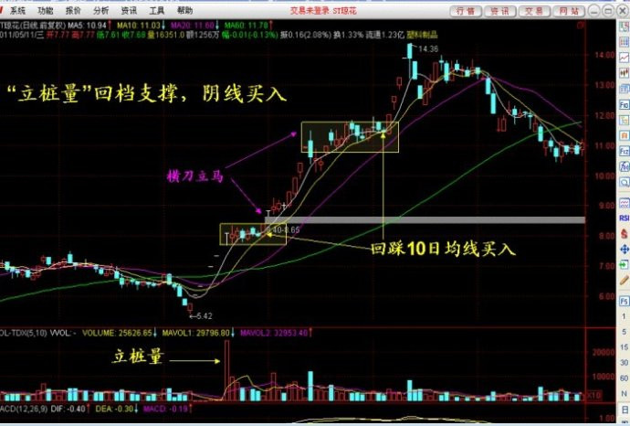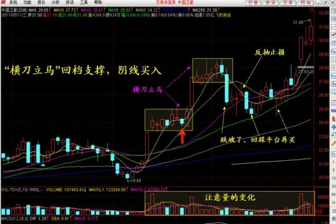 形态描述:突然一天,一根巨量腾空而起,当股价运行到一定高点,随后展开横盘整理,待10日均线慢慢跟上之时,此时会有一根阴线踩10日均线,阴线买入,第二天或第三天,往往会再次以大阳线突破。