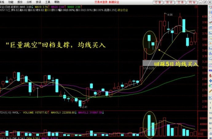 形态描述:股价脱离底部,突然一天,巨量跳空而起,紧接着股价在近日内回踩,待5日(或10日)均线慢慢跟上之时,此时会有一根阴线踩5日(或10日)均线,盘中阴线也算,当日买入,第二天或第三天,往往会再次以大阳线突破。