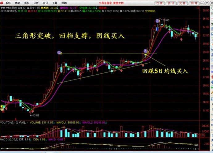 1、股价长期沿着三角形走势盘整,有一天忽然放量突破三角形顶端,此时予以关注(切记不要追高!),待回调这个三角形顶端时,阴线买入。