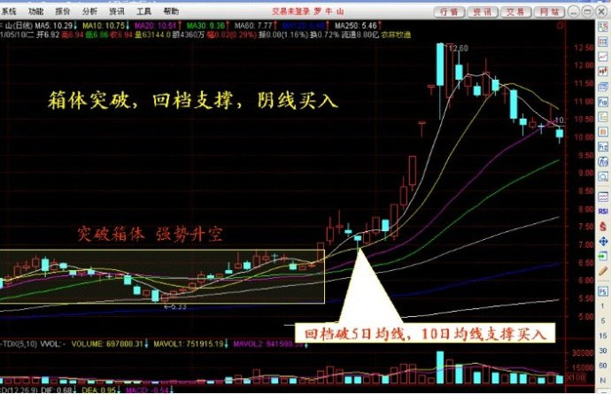 1、股价长期在一个箱体内盘整,有一天忽然放量突破箱体顶端,此时予以关注(切记不要追高!),待回调这个箱体顶端时,阴线买入。