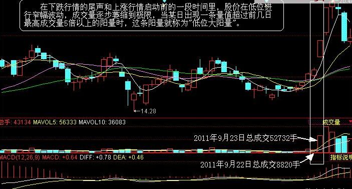 在下跌行情的尾声和上涨行情启动前的一段时间里,股价在低位进行窄幅波动,成交量逐步萎缩到极限,当某日出现一条量值超过前几日最高成交量5倍以上的阳量时,这条阳量就称为"低位大阳量"。