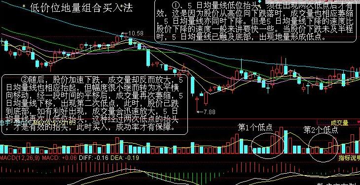 ①、低价位二次地量组合买入法,是一种较为可信的方法。但是要注意所处的位置,只有在股价较低的位置和5日均量线所形成的一个波浪的波谷附近出现的最低的成交量,才是我们所指的地量;其他位置出现的地量,均不是截们所指的低价位地量。
