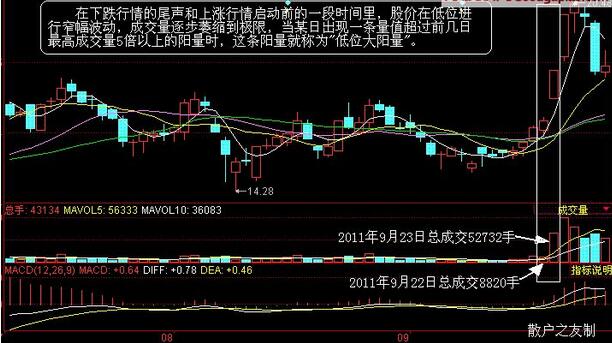 在下跌行情的尾声和上涨行情启动前的一段时间里,股价在低位进行窄幅波动,成交量逐步萎缩到极限,当某日出现一条量值超过前几日最高成交量5倍以上的阳量时,这条阳量就称为"低位大阳量"。