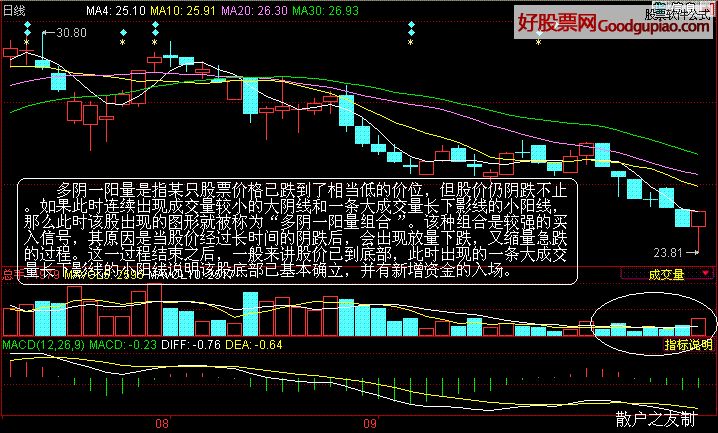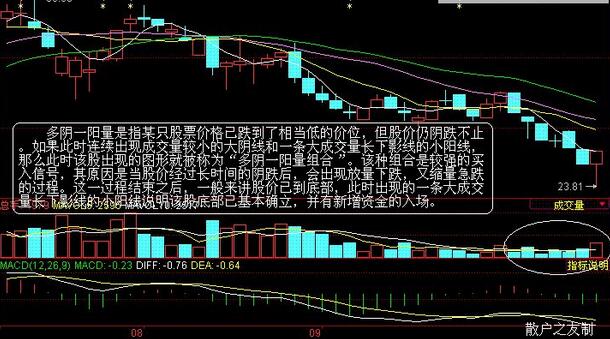 多阴一阳量是指某只股票价格已跌到了相当低的价位,但股价仍阴跌不止。如果此时连续出现成交量较小的大阴线和一条大成交量长下影线的小阳线,那么此时该股出现的图形就被称为“多阴一阳量组合”(多阴一阳量组合中的阴线应至少不低于四条,最多不应超过六条)。该种组合是较强的买入信号,其原因是当股价经过长时间的阴跌后,会出现放量下跌,又缩量急跌的过程。这一过程结束之后,一般来讲股价已到底部,此时出现的一条大成交量长下影线的小阳线说明该股底部已基本确立,并有新增资金的入场。(图二)