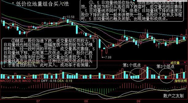 ②、按照低价位地量组合买入法,最好能够参考K线图的走势。如果K线图同时出现买入的信号,那么低价位地量组合买入法的有效性就更加高,可以放心买入。