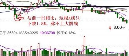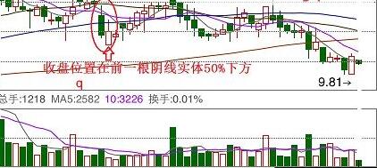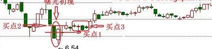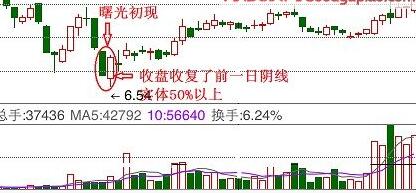 ⑴、牢记此技术的形态,若大阴线的第二天股价跳空低开高走,并且收盘收复了前日大半阴线,则为曙光初