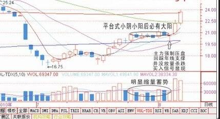 该图形一般出现在底部或者是大幅调整后的复苏阶段,也可判断为基金或者是长线资金主力的建仓阶段。