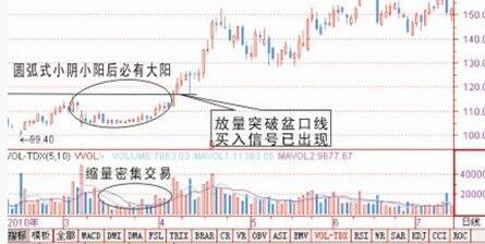 圆弧形态一般出现在调整后或者横盘整理挖坑后走出的图形,从技术形态上看有二个特别现象是,一个是在圆弧底位会出现密集交易区,(密集交易就是说持续几天的K线长短差不多),二是均量萎缩,但是阳线是有带量的,阴线非常缩量。但在圆弧快形成阶段量能会逐步放大,这个阶段为初步买入信号出现,一旦放量突破前弧口处为黄金介入点,如果你错过这一点位,那么一般突破后都会有一个回落过程,当然回落不破支撑线可再一次介入信号出现。如果这一次买入信号错过你必将后悔,因为后面少有机会介入了,不管后市怎么调整也难回到前面这个价位。一般出现类似圆弧图形的,在后期都会走一大波行情出来,圆弧越大,主力吸筹越多,后市走向越高。