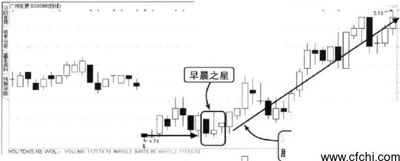 早晨之星也称为希望之星,是由简单的3根K线组成,其中,第一根为长久的下跌趋势中出现的实体修长的阴线,第二根为小阳线或小阴线,第三根为大阳线,且第三日收盘价必须大于第一个形态表示的收盘价,该信号为买入的最佳时机。