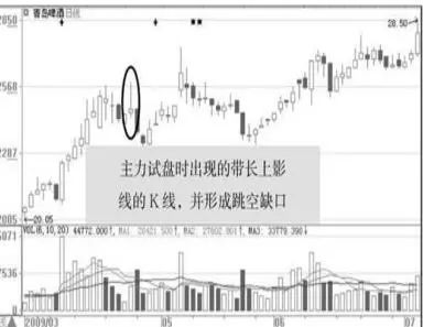 实例剖析:青岛啤酒(600600)中主力在低价位区域吸货完毕后,没有立即开始拉升股价,而是进入试盘阶段,故意将股价向下打压,在试盘过程中,于2009年4月24日形成了一根带长上影线的阳线,并且与前一日的K线形成一个跳空缺口,很快主力试盘完成后就将股价拉回了原价,如图所示。