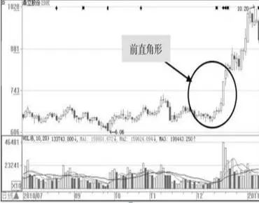 直角形又分为前直角形和后直角形。所谓前直角形是指主力在底部经过长时间的建仓,在日K线图上形成了水平走势,然后主力突然在某一两天大幅向上拉升或向下打压股价,在形态上几乎呈直角形,也就是前直角形,如图所示。