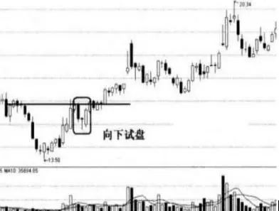 当股价运行到重要的支撑位置时,股价会突然出现快速下跌,击穿这个重要的支撑位,随后股价又会很快被拉起,收盘的时候就会收出一根带长下影线的K线,这是主力在试探下档支撑位置的承接情况。
