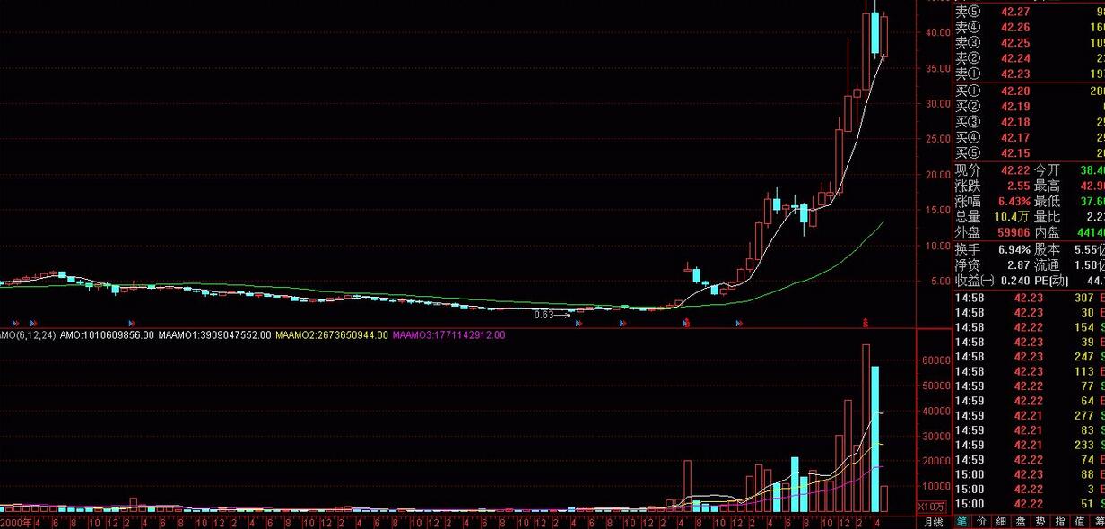 其后,该股2007年3月形成月线起涨点,到2010年4月见顶,走完月线中的5浪上升形态,从1.25元,涨到47元上方,历时整整3年,主力非常完美的构造了清晰,规律,量价关系完美的月线大势图。三年出色表现,一定是老道实力雄厚的操盘大师的杰作。看上去,很是完美!
