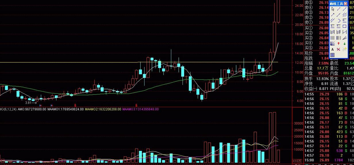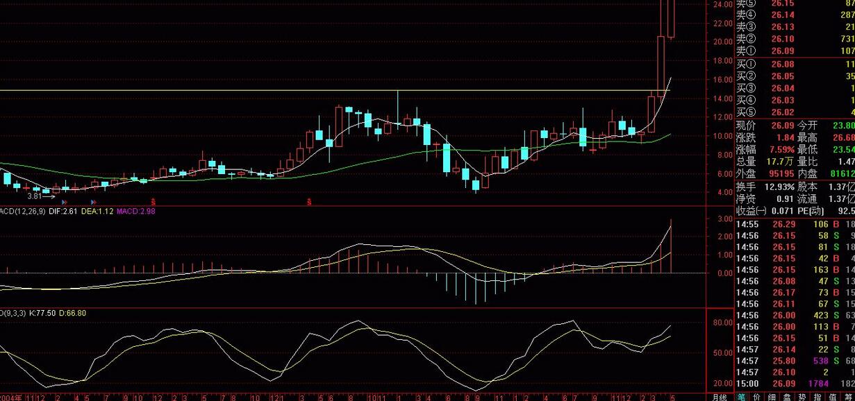 月线MACD在O轴上方金叉中出现"龙抬头",必创出历史新高价,KD在50以上数值强势区金叉,强势上攻已成定局。而K线,三月收出一个放历史最大量量的中阳的"芙蓉出水",是明确的总攻击信号弹。