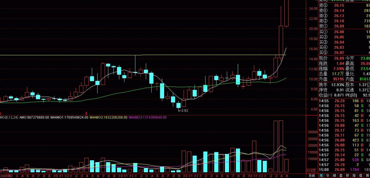 第一,2010年4月,14.77元必破的理由。主要是MA5月均线与月线的生命线30月线早已金叉,且股价完成对30月线的回抽。最关键的是,5月均线已靠近历史阻力线14.77元的下方附近了,多方之兵已临城下,攻破它,已无悬念!这是均线理论的依据!AMO,成交量也支持这一判断,三条均量线已金叉多头数月,多头有很明显的持续放量建仓行为,且已完成缩量洗盘。三月又二次金叉多头,量为价先,三月成交额是10年来的最大月量,天量。最重要的是,三月曾上冲到14.87元,高于14.77元历史高位0.1元,多头攻击试盘了!其他技术指标也发出了多头强势攻击信号,如,MACD,KD.看一下下面的月线MACD,KD,指标数据的提示,便可明了。