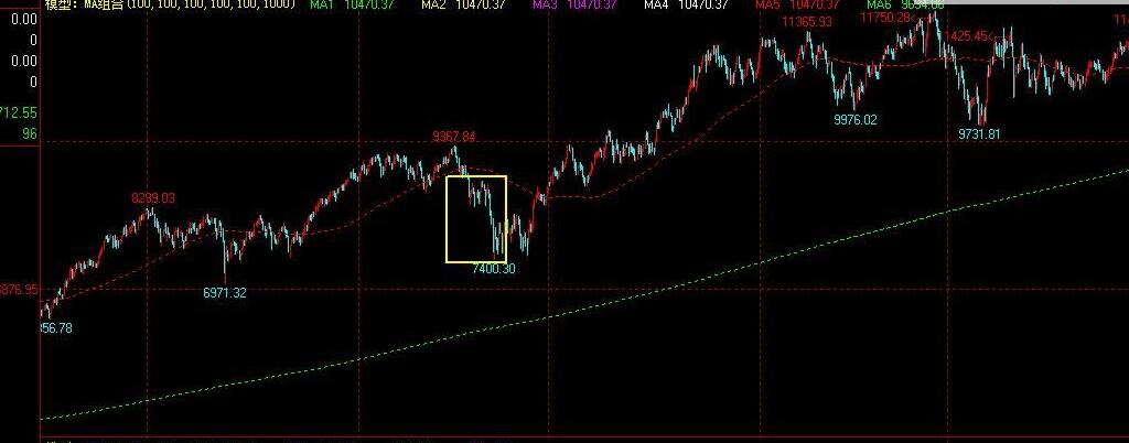 再回到上图,还是看黄框的行情,按照1000日线级别操作,在9367高点下来、后面再回到9367点的时候,你的账户没有变化。按照100日线级别操作,从跌破100日线翻空到回上100日线翻多,做了一个小小的正差价,提高了一点点的收益。